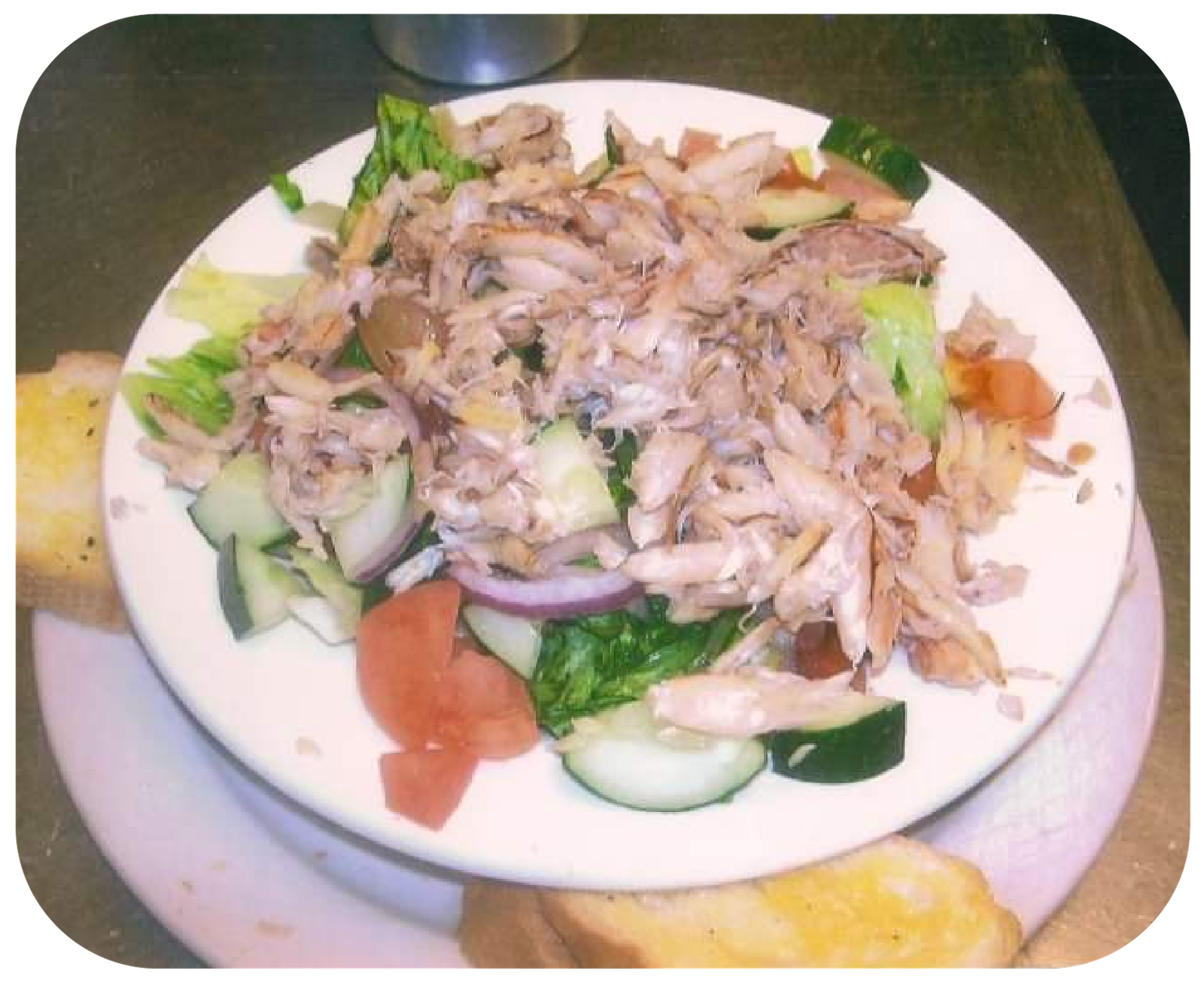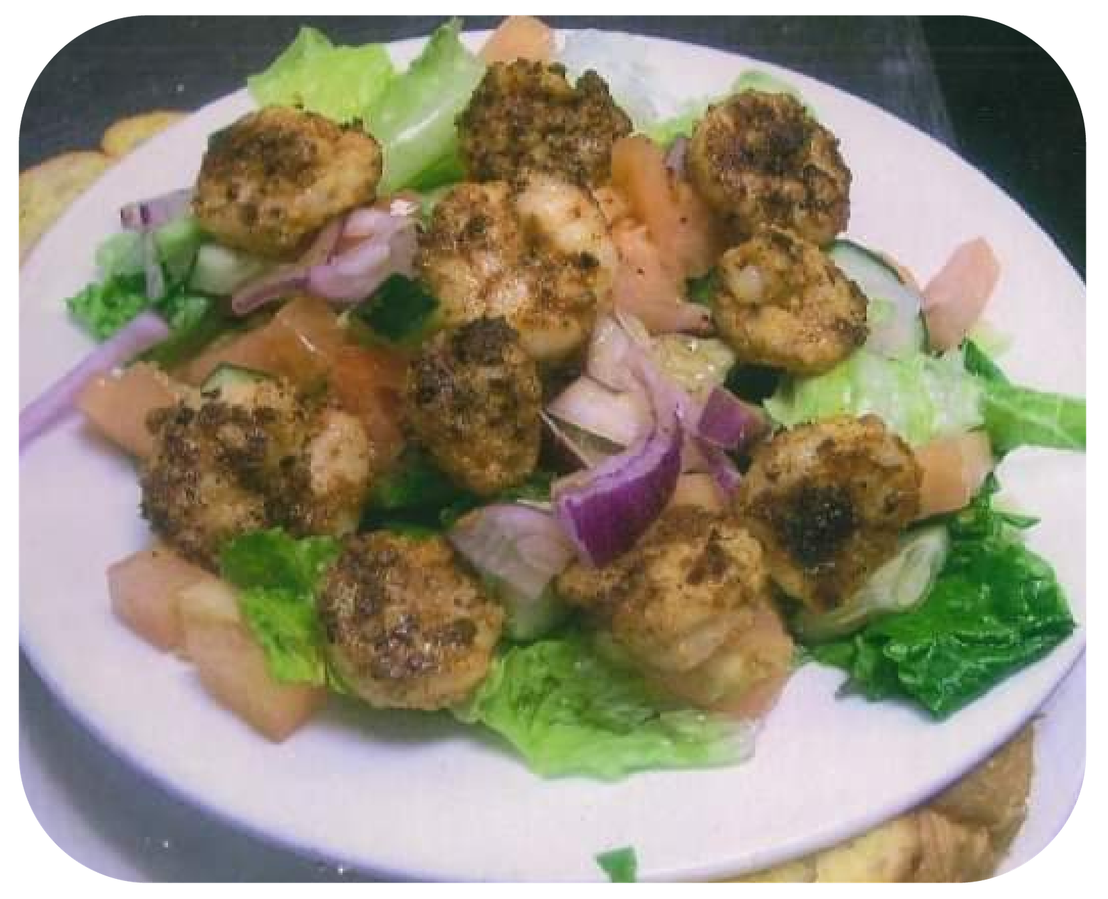 SALADS INCLUDE ICEBERG & ROMAINE LETTUCE, CUCUMBERS, TOMATOES, AND RED ONIONS.