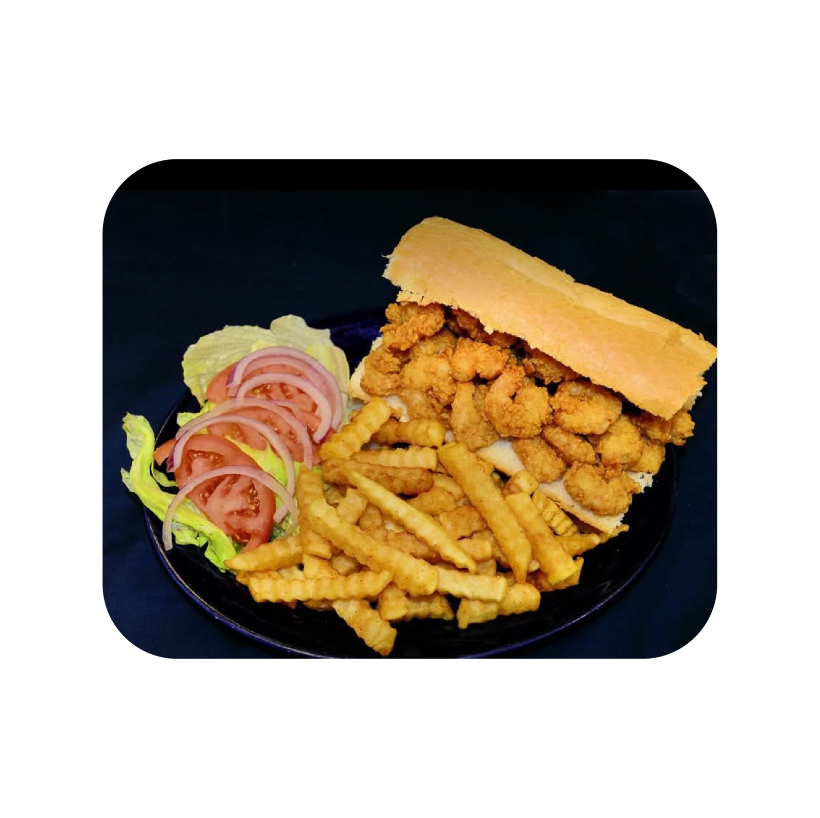 DINNER PO’BOYS ARE 6 IN AND COME WITH LETTUCE, TOMATOES, ONIONS & ONE SIDE.