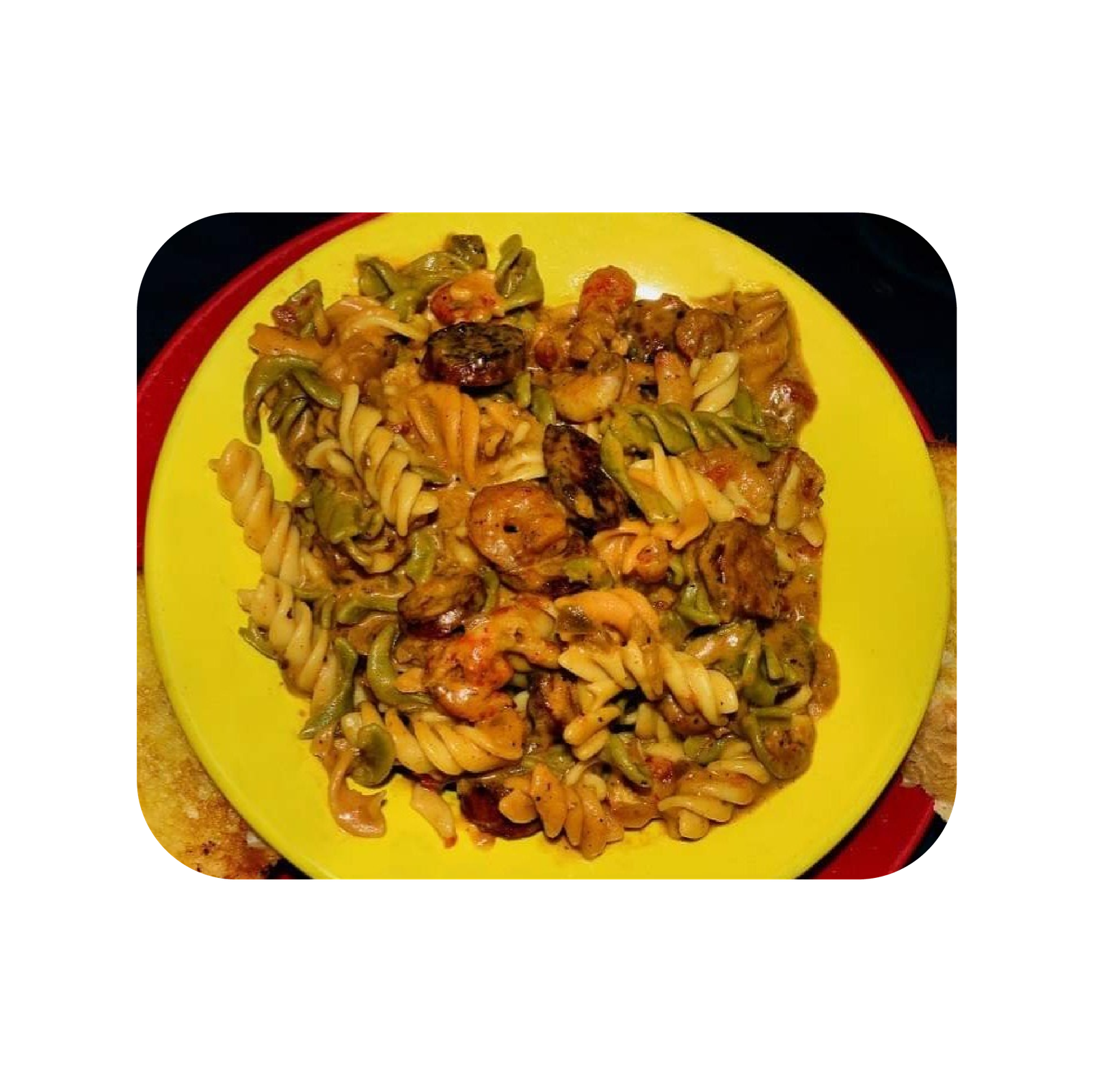 SHRIMP, CAJUN SAUSAGE, AND CRAWFISH TOSSED IN OUR HOMEMADE JULIE SAUCE WITH TRI-COLORED ROTINI PASTA.
